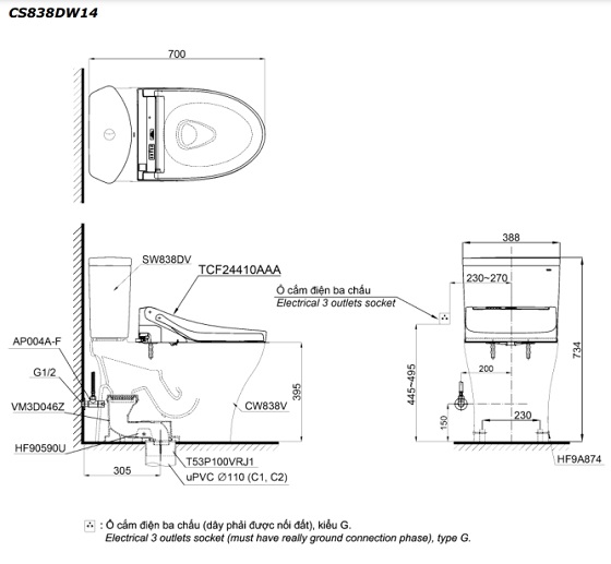 Lượng nước xả: 4.5L/3L