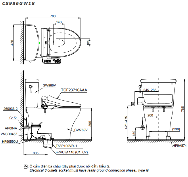 Bồn cầu 2 khối kèm nắp rửa điện tử Toto CS986GW18