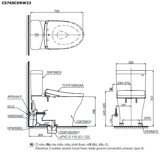 Bồn cầu 2 khối nắp rửa điện tử Washlet S7 Toto CS769CDRW23