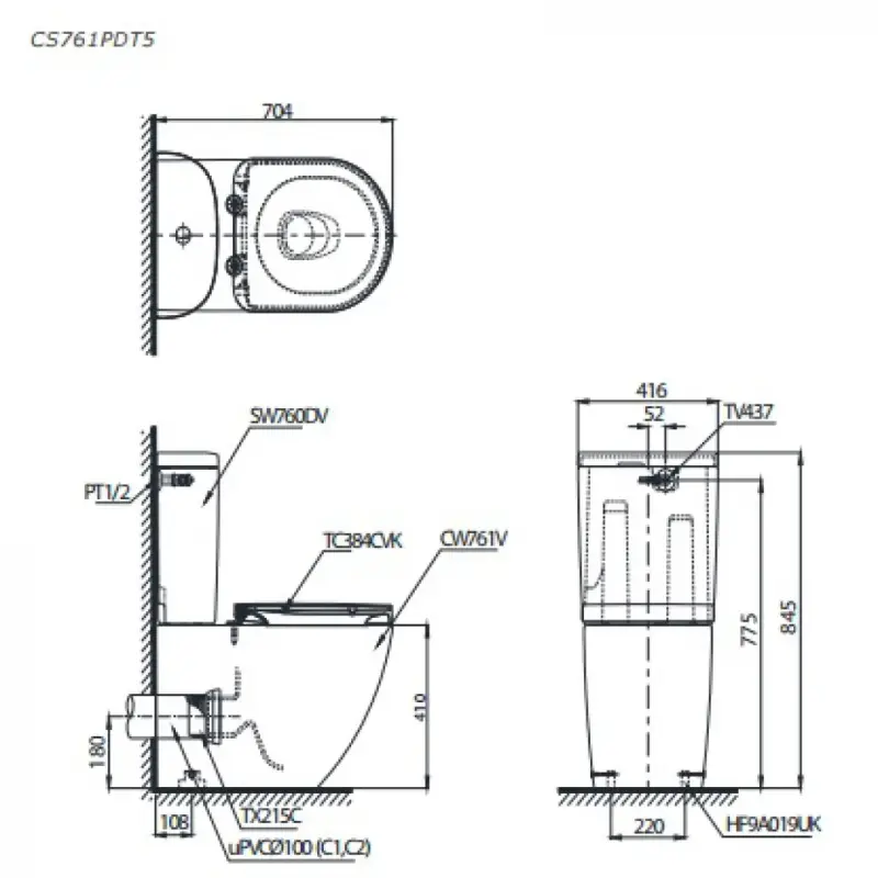 Thông Số Kỹ Thuật Chi Tiết Của Bồn Cầu 2 Khối TOTO CS761PDT5:
