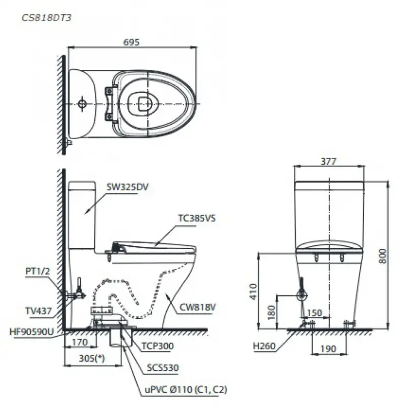 - Cấu tạo: Thân cầu (C818), Két nước (S818D), Nắp bồn cầu (TC385VS).