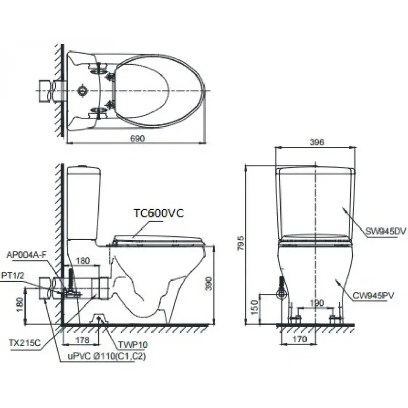 - Cấu tạo: Thân cầu (C945P), Két nước (S945D), Nắp bồn cầu (TC600VS).