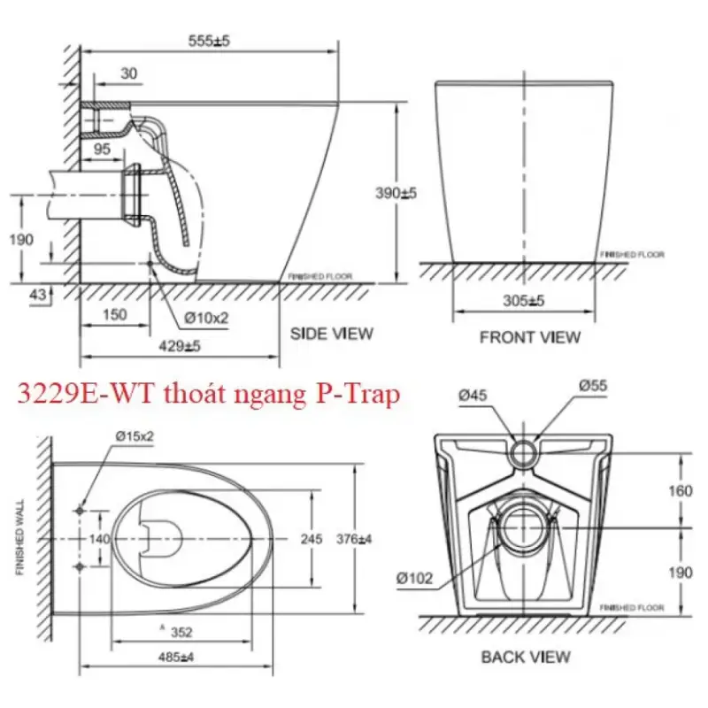 - Thoát ngang P-Trap: Tâm thoát 190 mm.