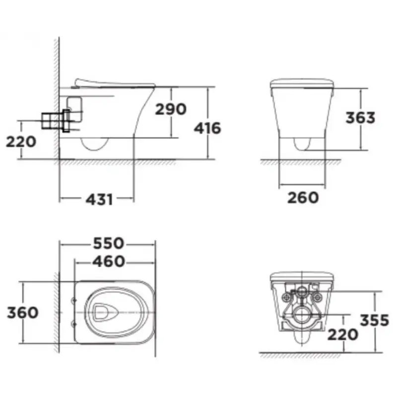 - Thoát ngang: Tâm thoát 220mm.