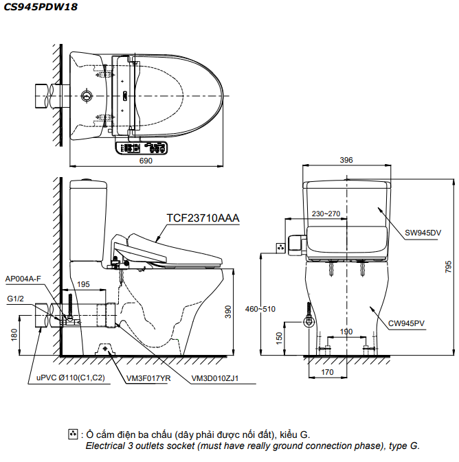 Bồn cầu hai khối kèm nắp rửa điện tử TOTO CS945PDW18