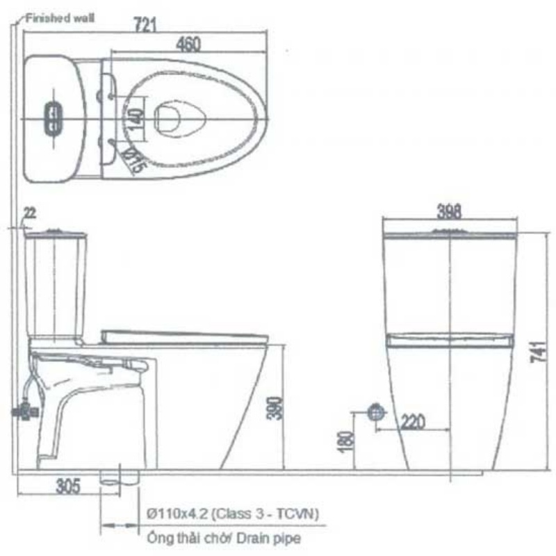 - Kích thước bồn cầu: 720 x 372 x 740 mm.