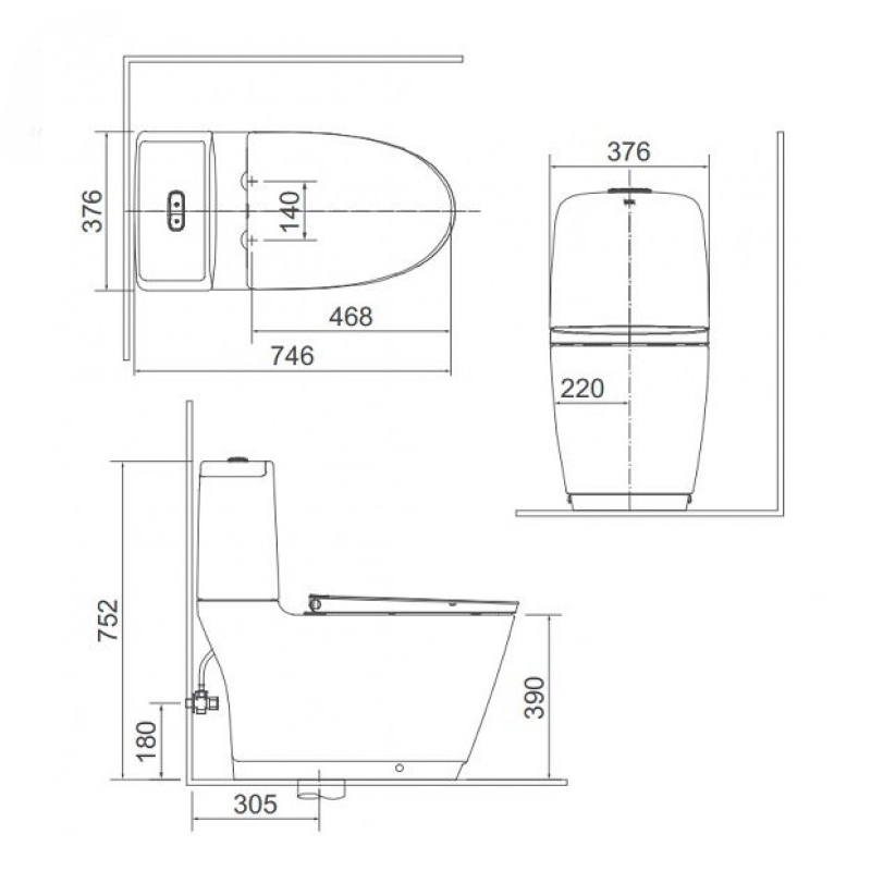 - Kích thước bồn cầu: 746 x 376 x 752 mm.
