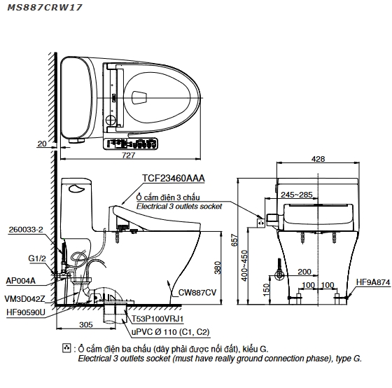 Bàn cầu một khối kèm nắp rửa điện tử WASHLET dòng C2 TCF23460AAA