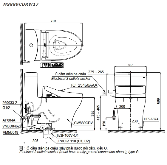 Bồn cầu một khối kèm nắp rửa điện tử TOTO MS889CDRW17