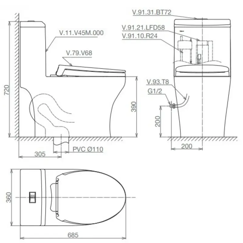 - Kích thước bồn cầu: 685 x 360 x 720 mm.