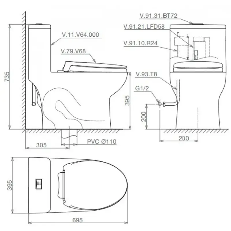 Thông Số Kỹ Thuật Chi Tiết Của Bồn Cầu Một Khối Viglacera V64+VG826+VG853: