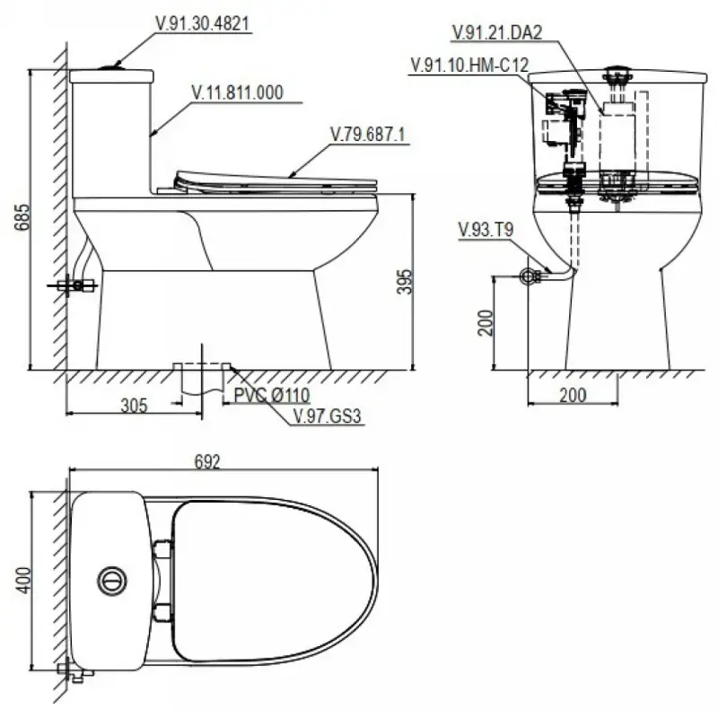 - Kích thước bồn cầu: 692 x 400 x 685 mm.