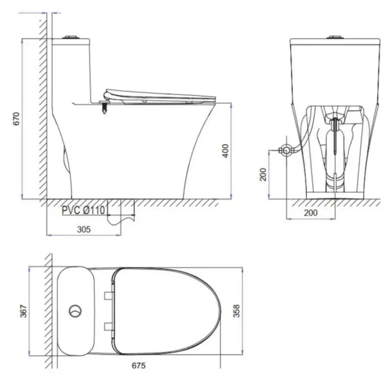 - Kích thước bồn cầu: 675 x 367x 670 mm.