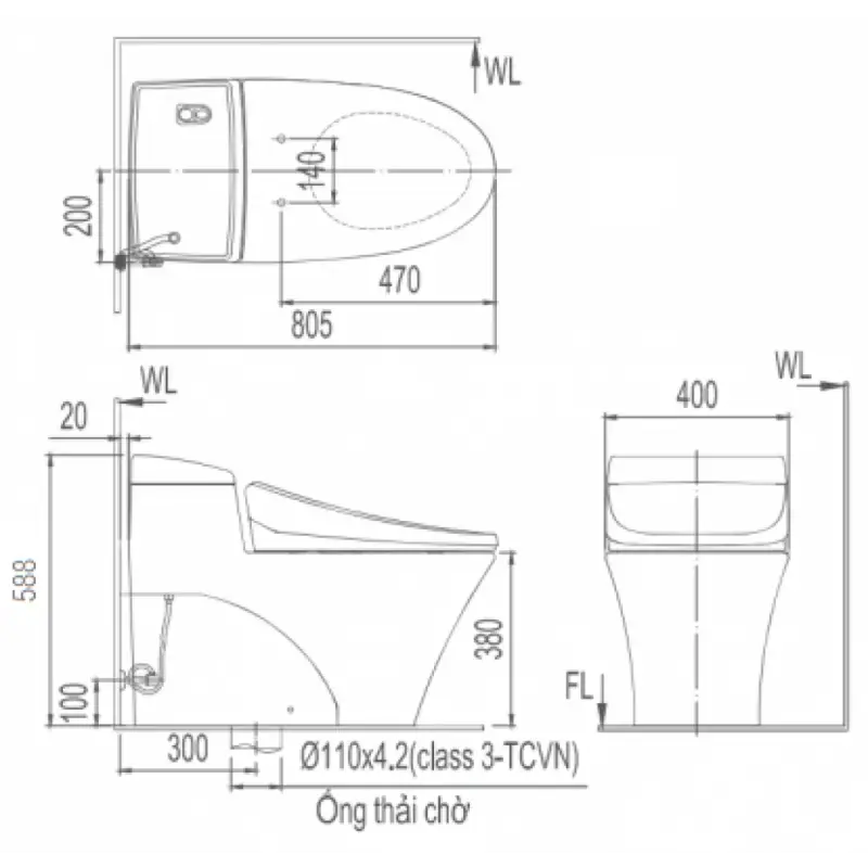- Kích thước bồn cầu: 805 x 400 x 588 mm.