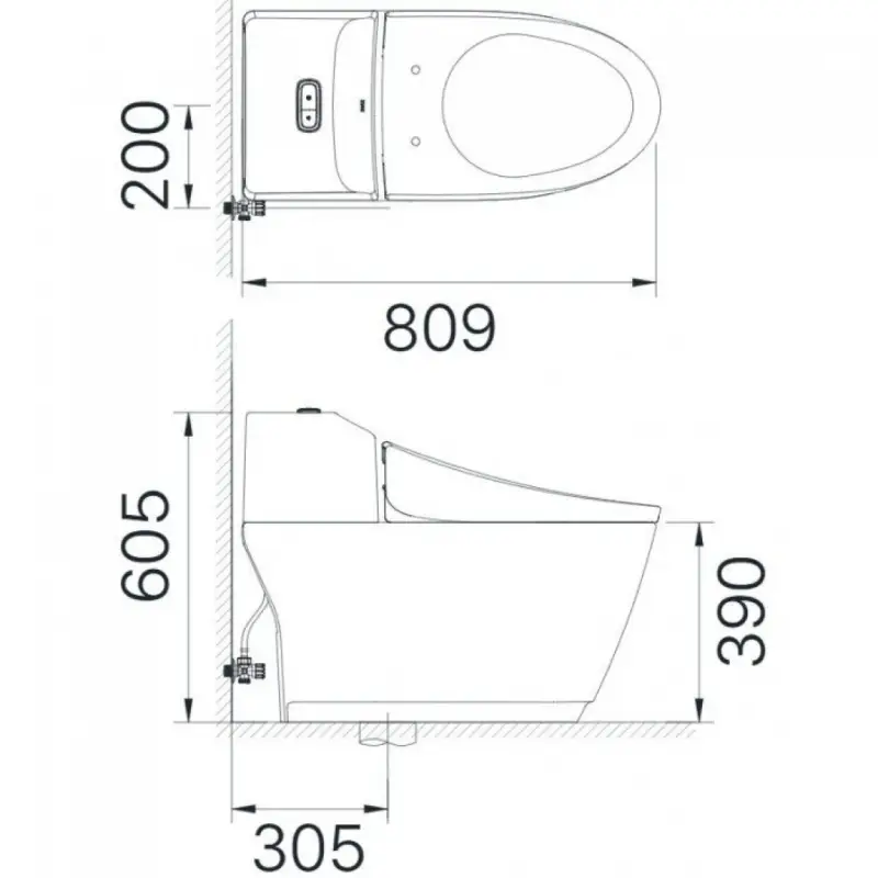 - Kích thước bồn cầu: 809 x 372 x 605 mm.