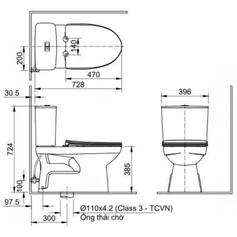 - Kích thước bồn cầu: 728 x 396 x 724 mm.