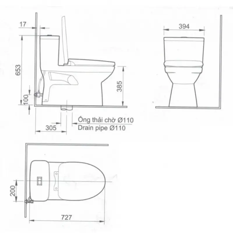 - Kích thước bồn cầu: 727 x 394 x 663 mm.