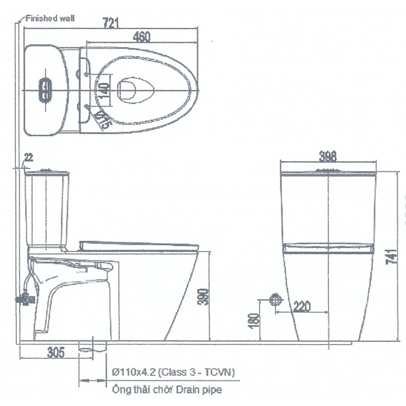 - Hệ thống xả: Xả cảm ứng chạm, kiểu xả nhấn 2 mức 4.5L/3L.