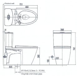 - Kích thước bồn cầu: 720 x 372 x 740 mm.