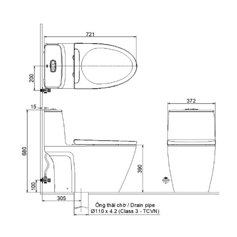 - Kích thước bồn cầu: 721 x 372 x 680 mm.