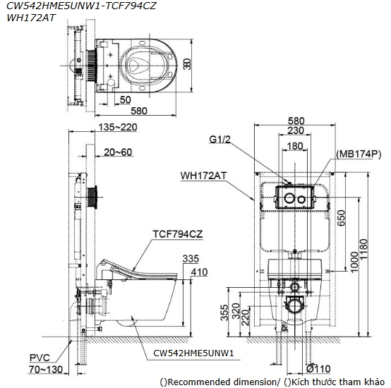 Bàn cầu treo tường kèm nắp rửa điện tử WASHLET seri RX