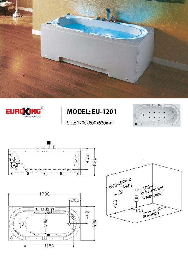 Thiết kế của EU – 1201 chỉ 1700 x 800 x 620 mm thích hợp cho những phòng tắm diện tích nhỏ.