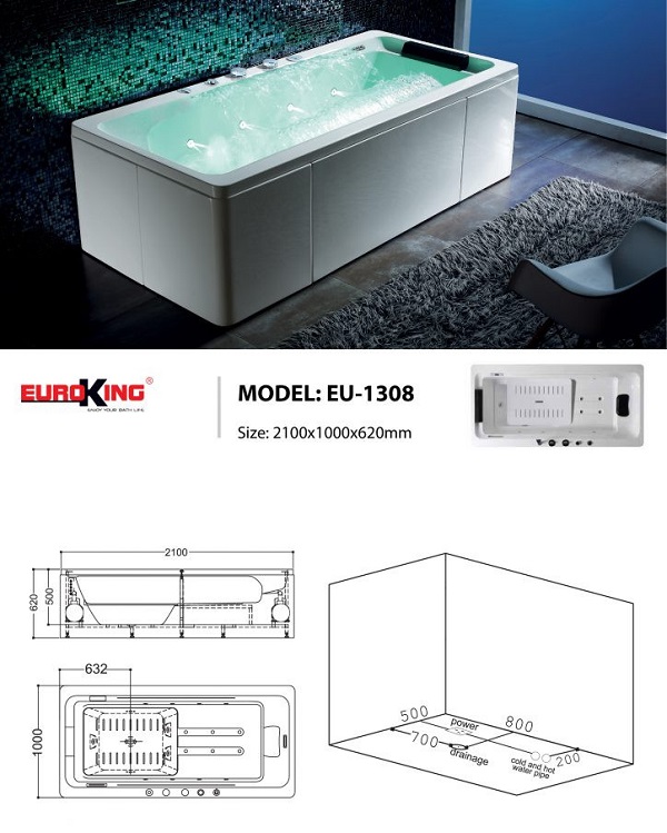 Bồn tắm massage Euroking EU-1308 với tính năng massage toàn bộ cơ thể bằng hệ thống massage thủy lực; tạo dòng nước nước xoáy vặn massage mang tới cảm giác thư giãn sảng khoái.