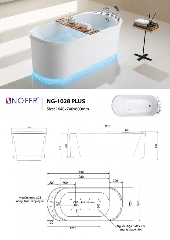 Bồn tắm nằm đặt sàn Nofer NG-1028 (1640x740x600 mm)