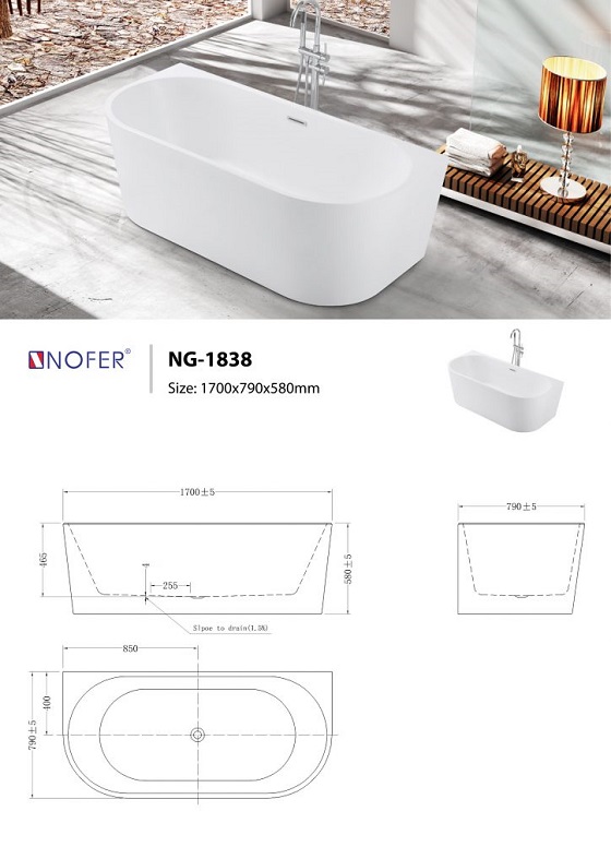 Bồn tắm nằm đặt sàn Nofer NG-1838 (1700x790x580 mm)