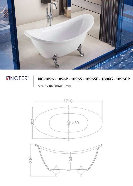 Màu trắng bóng truyền thống của những chiếc bồn tắm vẫn được phủ lên NG-1896. Và 4 chiếc chân mạ chrome mang đến sự lấp lánh của kim loại. NG-1896 sẽ không bao giờ bị lỗi thời dù ở thời điểm nào. Thiết kế này cũng giúp cho NG-1896 dễ dàng phối hợp với các kiểu kiến trúc khác nhau.
