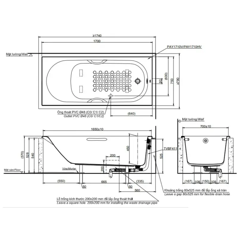 Thông Số Kỹ Thuật Chi Tiết Của Bồn Tắm Toto PAY1710V: