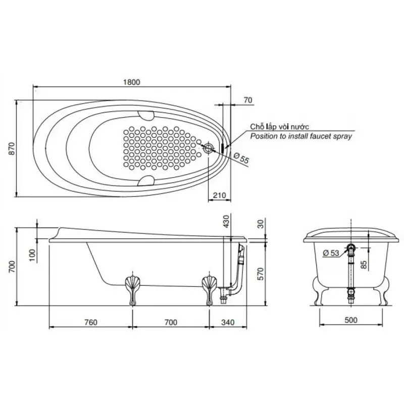 - Kích thước: 1800x870x700mm (Xem chi tiết ở phần hướng dẫn lắp đặt).