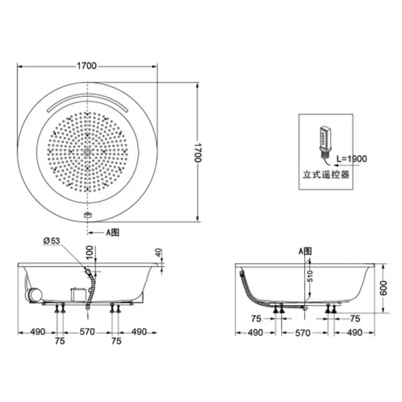 - Kích thước: 1700x1700x600mm (Xem chi tiết ở phần hướng dẫn lắp đặt).