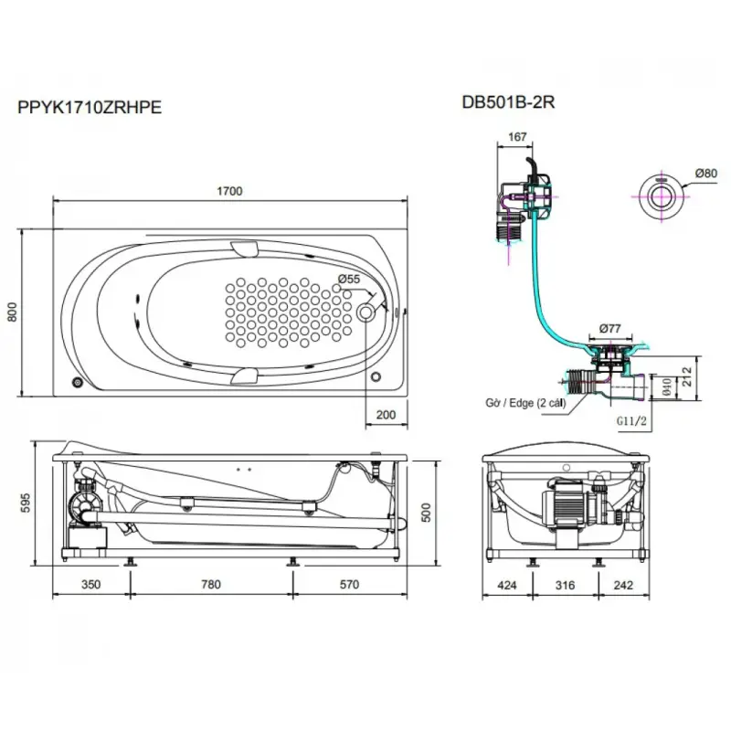 - Kích thước: 1700x800x595mm (Xem chi tiết ở phần hướng dẫn lắp đặt).
