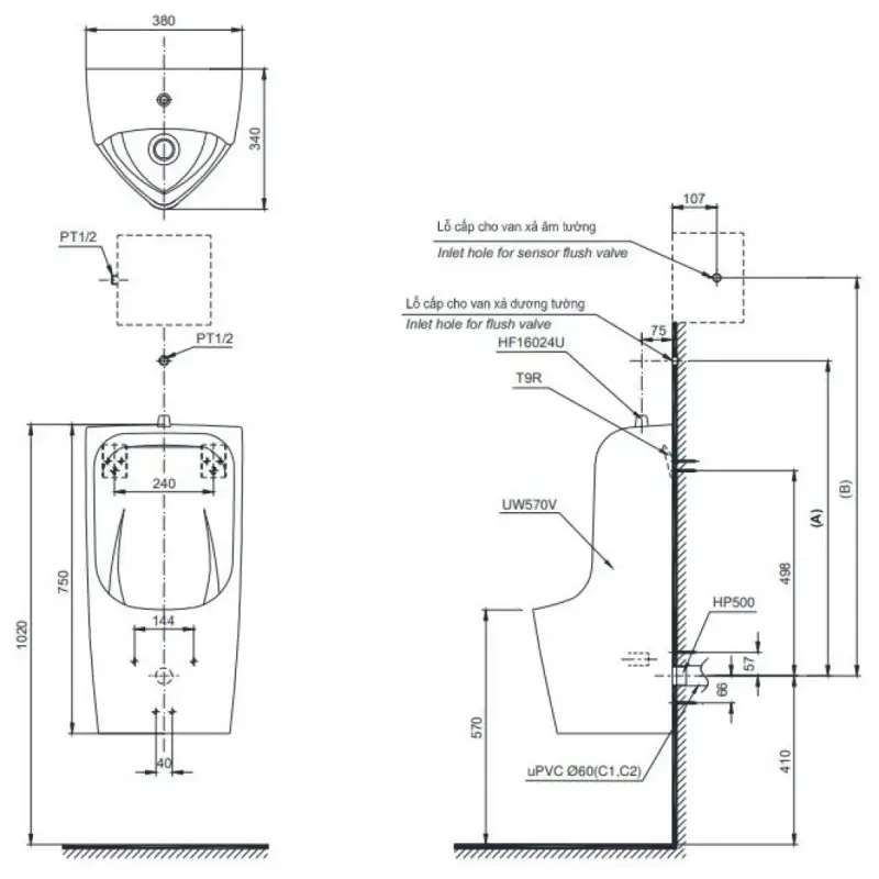 Thông Số Kỹ Thuật Chi Tiết Của Bồn Tiểu Nam Toto UT570T: