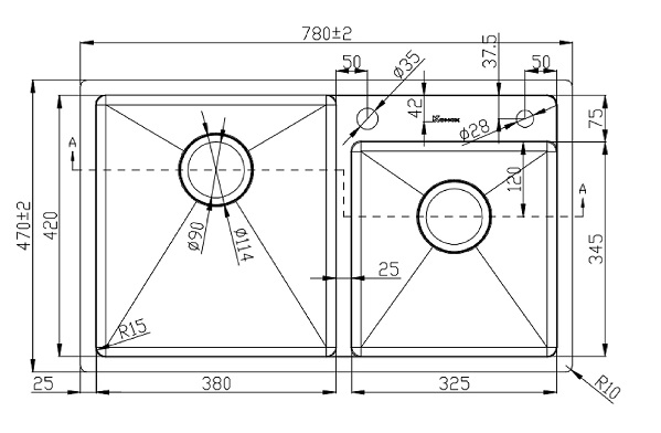 Kích thước hố(mm): 380*420;325*345