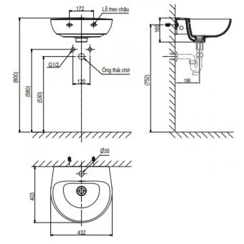 - Kích thước lavabo: 432 x 403 x 165 mm.