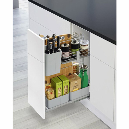 Trọn bộ bao gồm kệ để dao, rổ tháo rời, hộc đựng đũa, khay để dụng cụ, rỗ đựng chai lọ, hộc nhựa và ray trượt giảm chấn