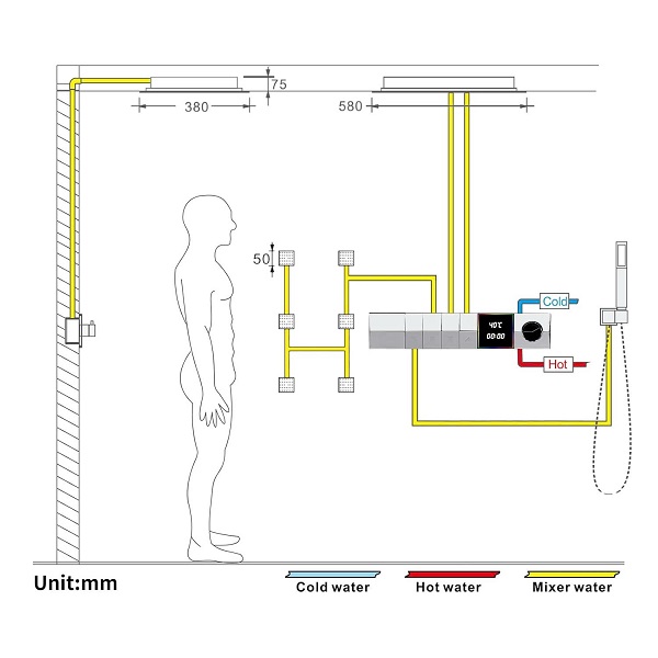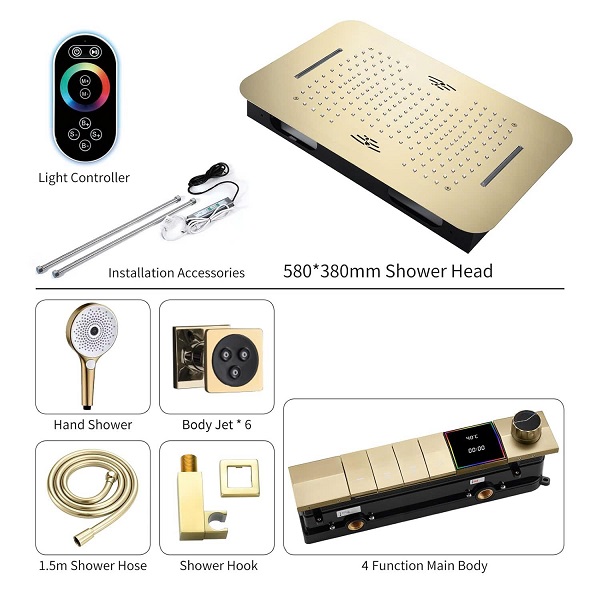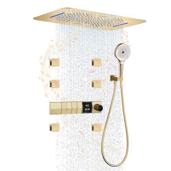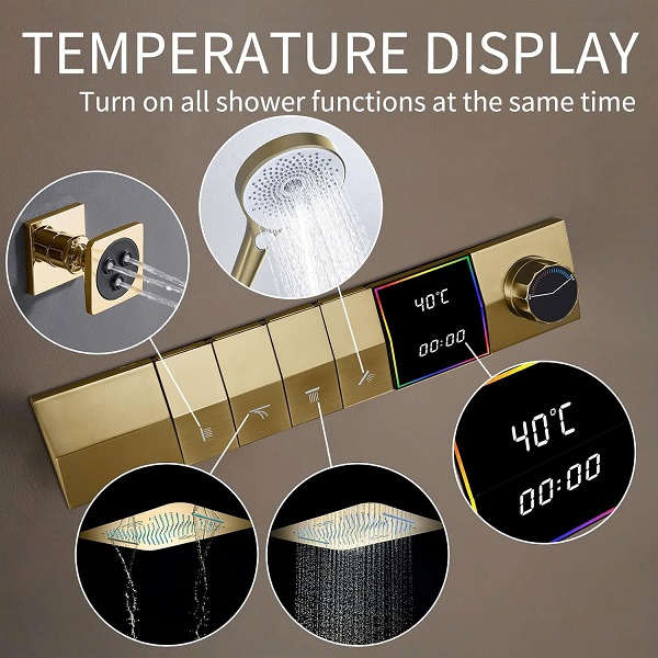 Sen tắm mạ crom màu vàng âm tường bát vuông gắn trần điều chỉnh nhiệt độ