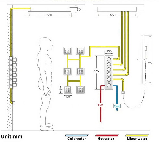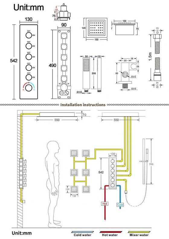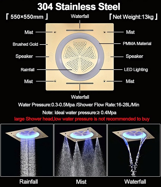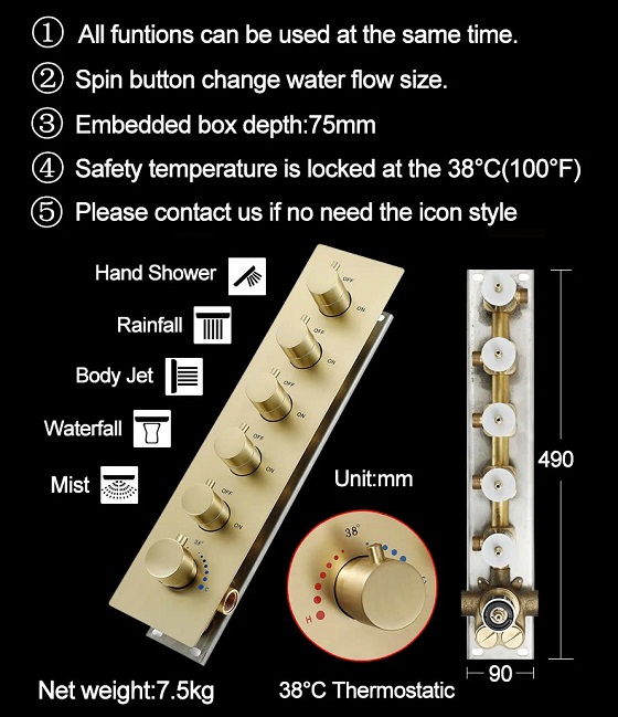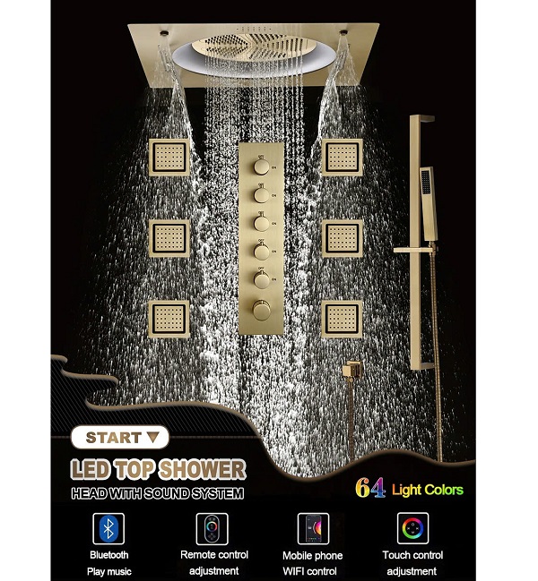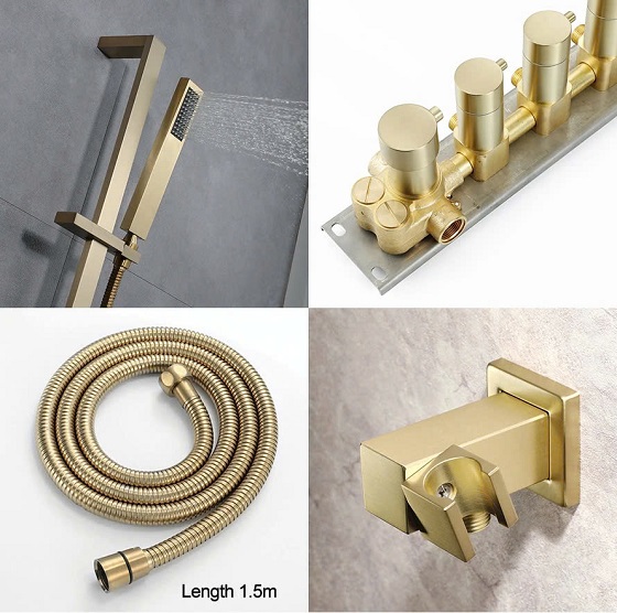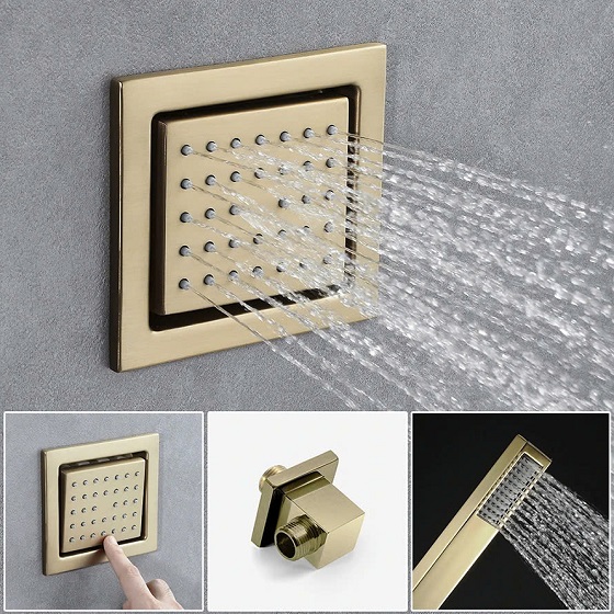 Sen tắm mạ crom màu vàng âm tường bát vuông gắn trần điều chỉnh nhiệt độ