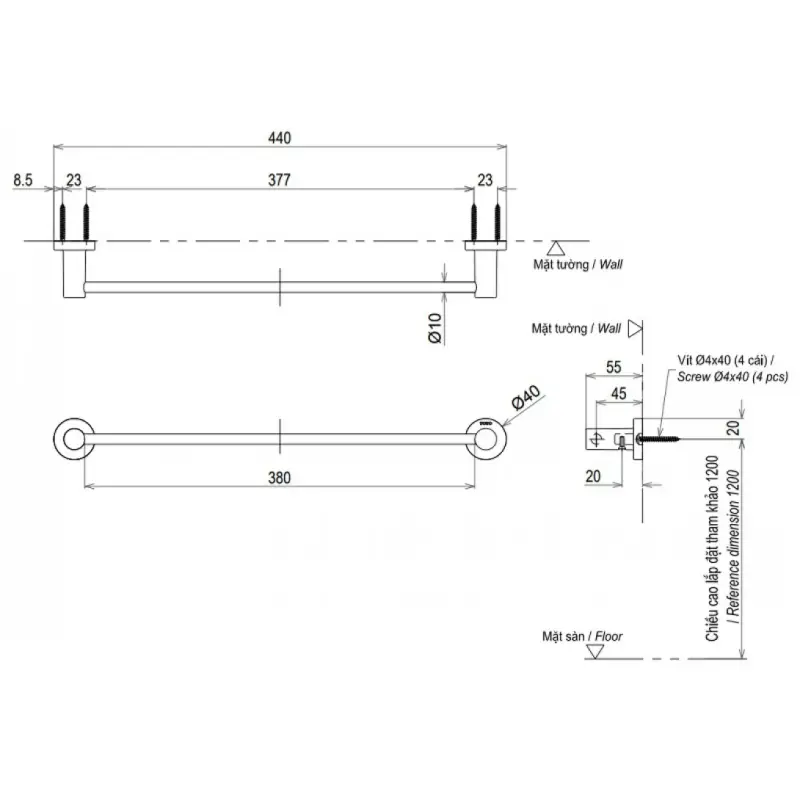 - Kích thước: 440x55x400mm (Xem chi tiết xem ở phần hướng dẫn lắp đặt).