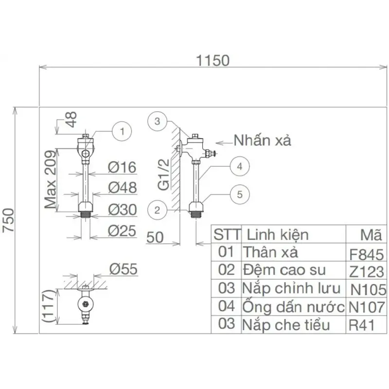 Van xả bồn tiểu nam Viglacera VG845 (VGHX05) ống thẳng