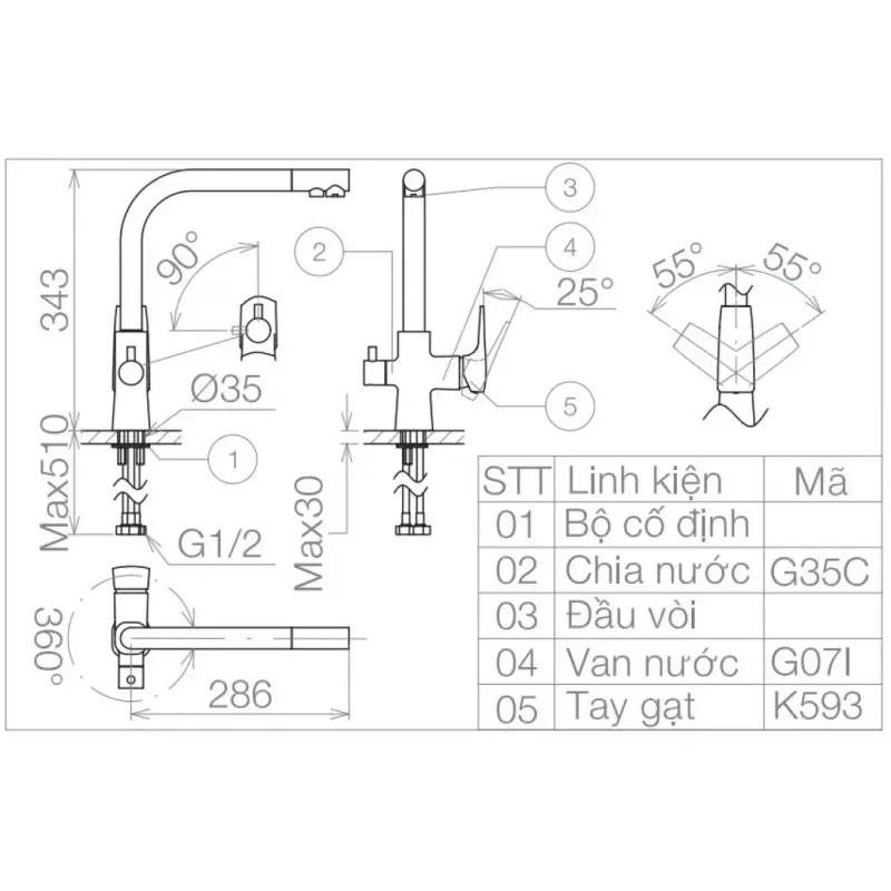 Vòi bếp Viglacera VG713 nóng lạnh kèm van lọc RO