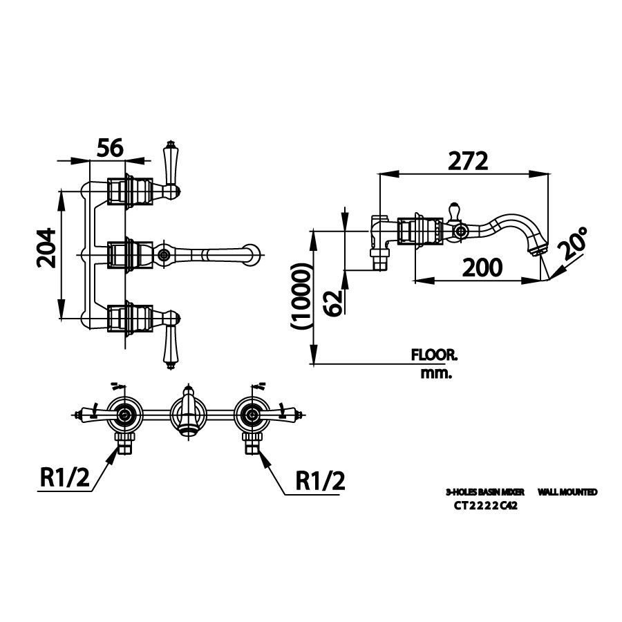 Vòi chậu lavabo nóng lạnh 3 lỗ gắn tường COTTO CT2222C42