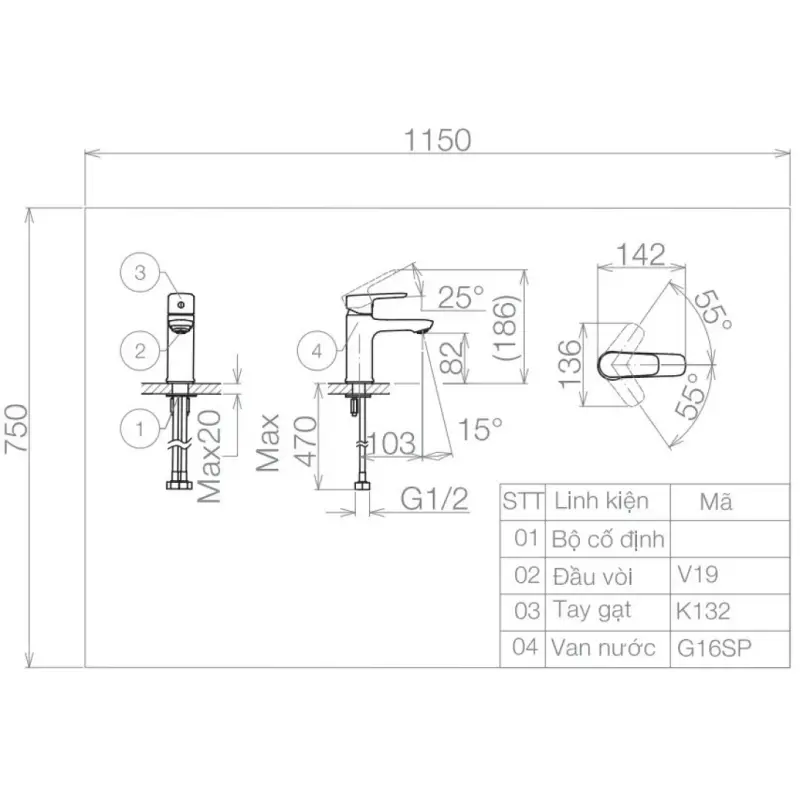 Vòi chậu lavabo nóng lạnh Viglacera VG132 thân thấp