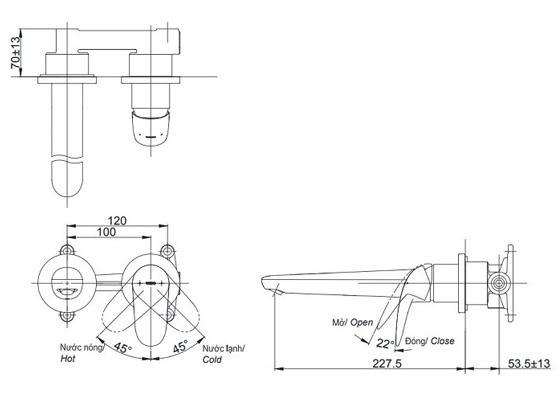 Kích thước vòi (từ tâm xả nước đến tường): 227.5 mm