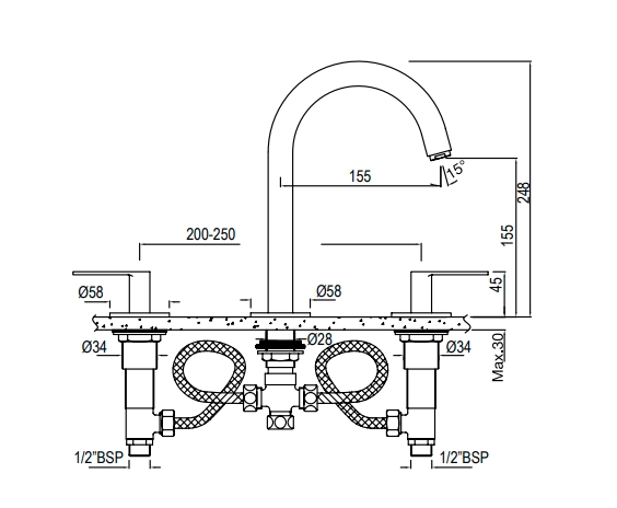 Vòi nóng lạnh cho chậu rửa, kiểu 3 lỗ, thân đúc, tay gạt, không kết hợp nhấn xả