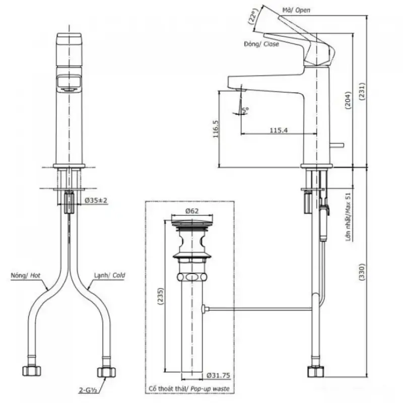 - Áp lực nước: 0.05MPa ~ 0.75MPa.