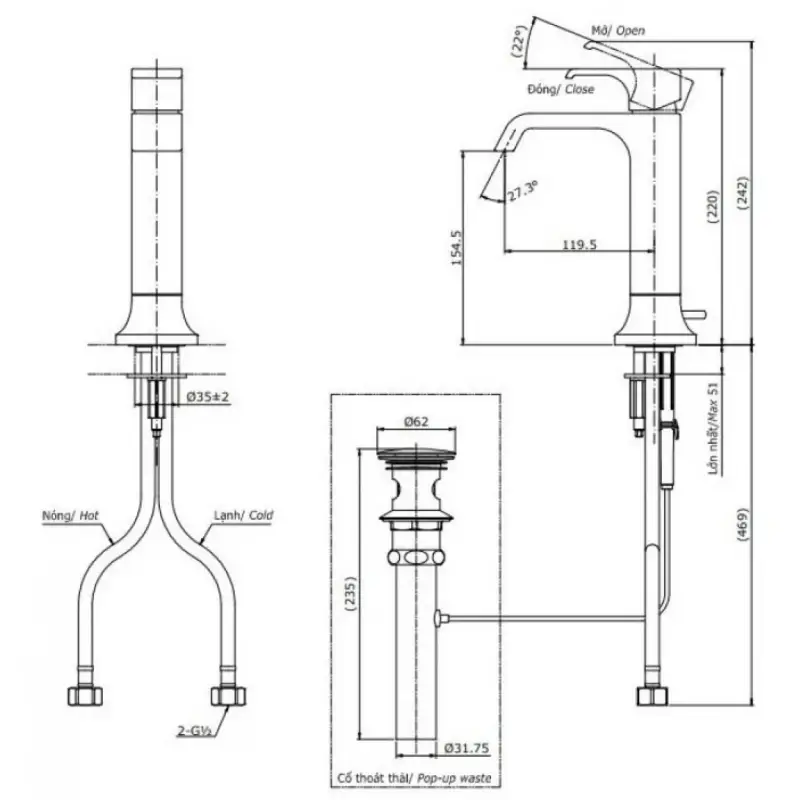 - Lắp đặt: 1 lỗ.
