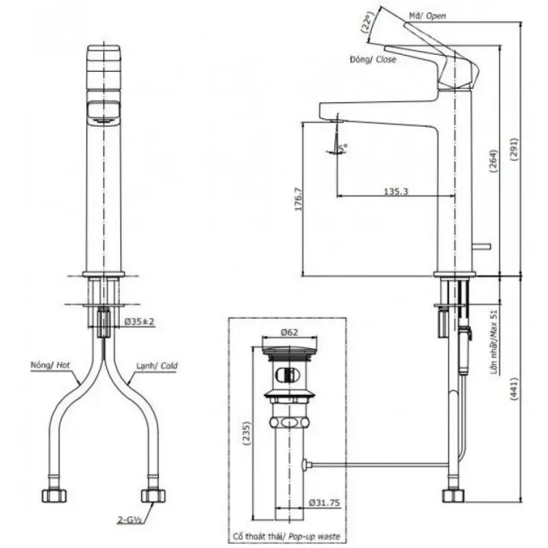 - Lắp đặt: 1 lỗ.